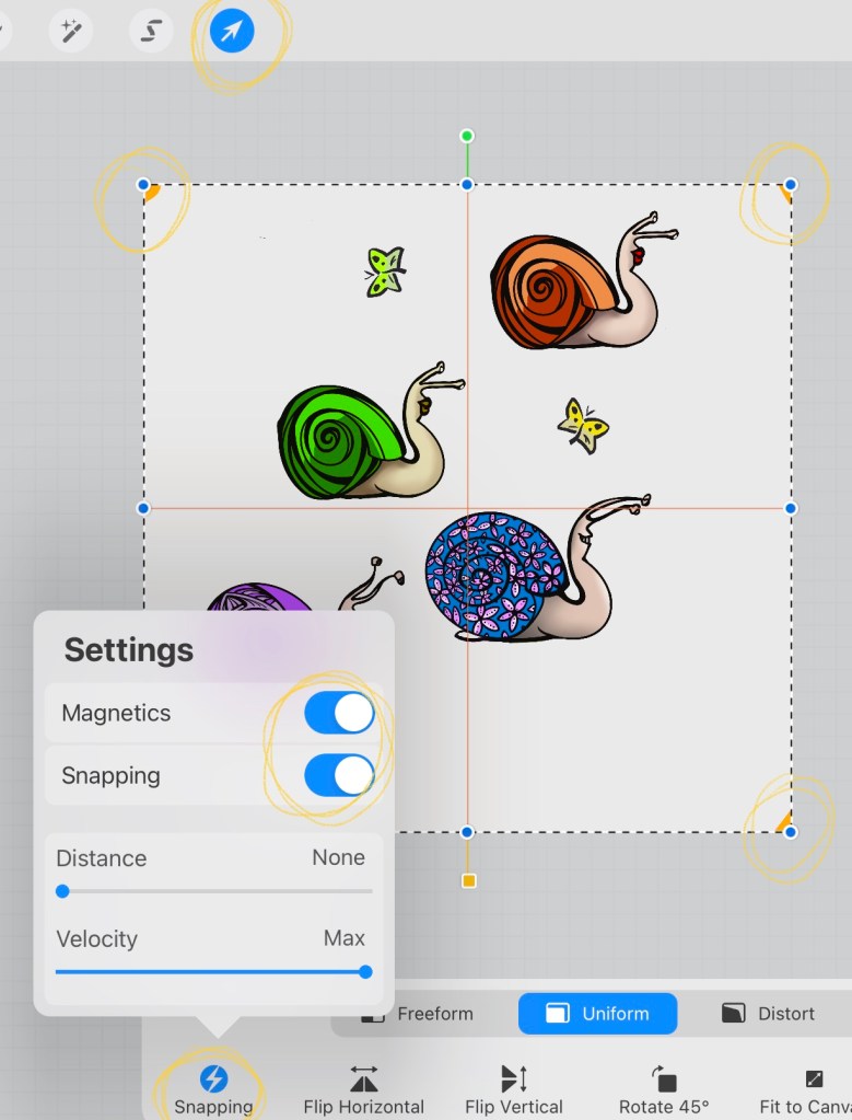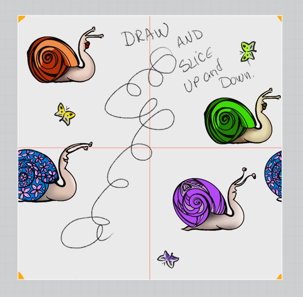 Step 1: I will always draw on the middle-left area and leave some space for the repeat (see below: I did draw some snails and the orange lines represent the future slices I will make with space left)