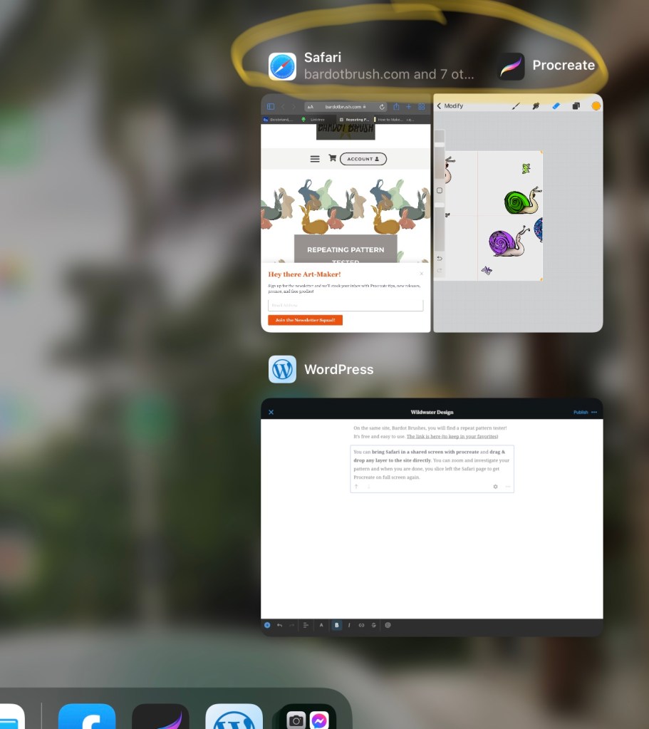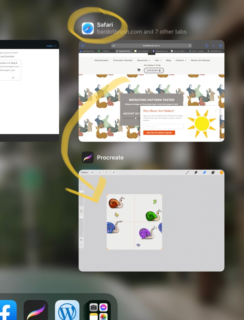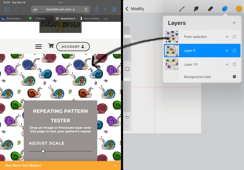 Note that is you are working with multiple layers and you don’t want to merge them now, you can do the “Copy All” option (you slice 3 fingers down, and select Copy All) and paste (you slice 3 fingers down again, and select Paste — all layers and background will be together in one new layer! You can drag this layer in Bardot Brush repeat site and preview your pattern – then you can delete this layer…